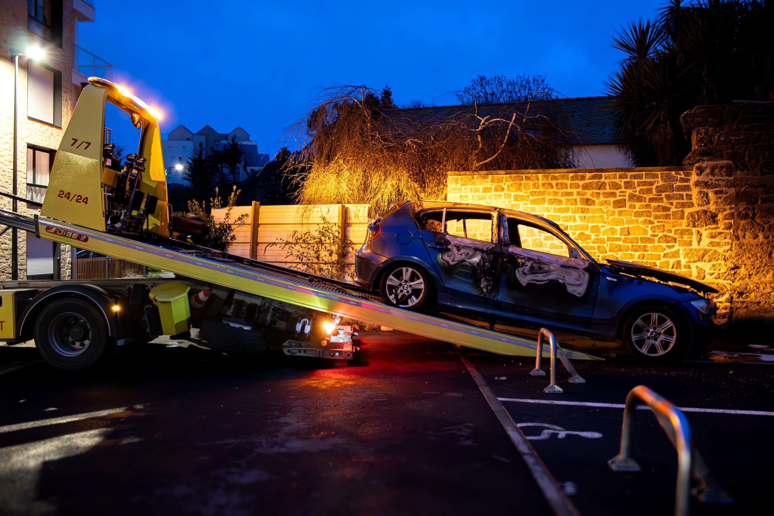 voiture entrain d'être montée sur la dépanneuse.