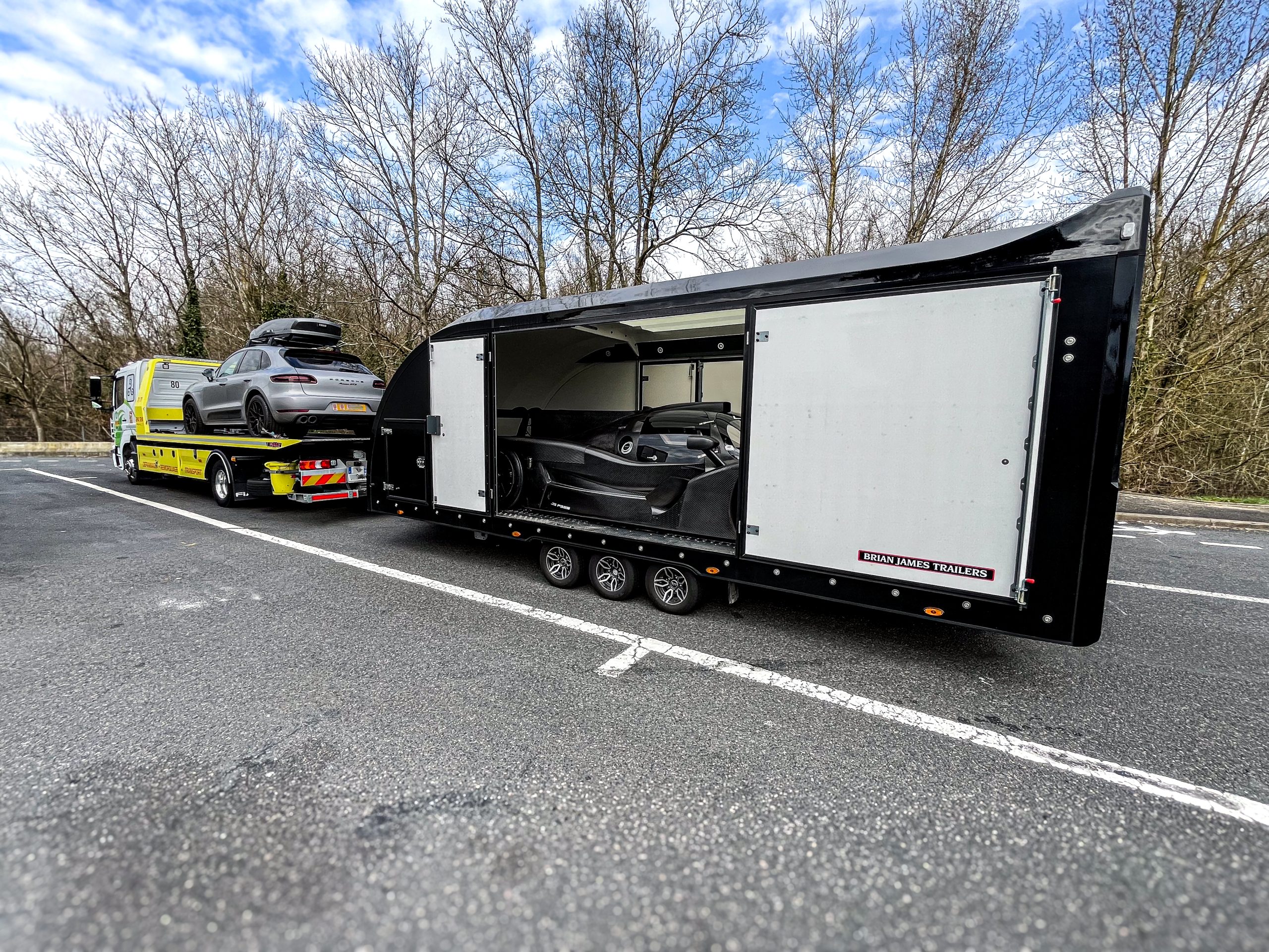transport d'un véhicule sur le plateau et d'un véhicule de course dans une remorque spécifique.